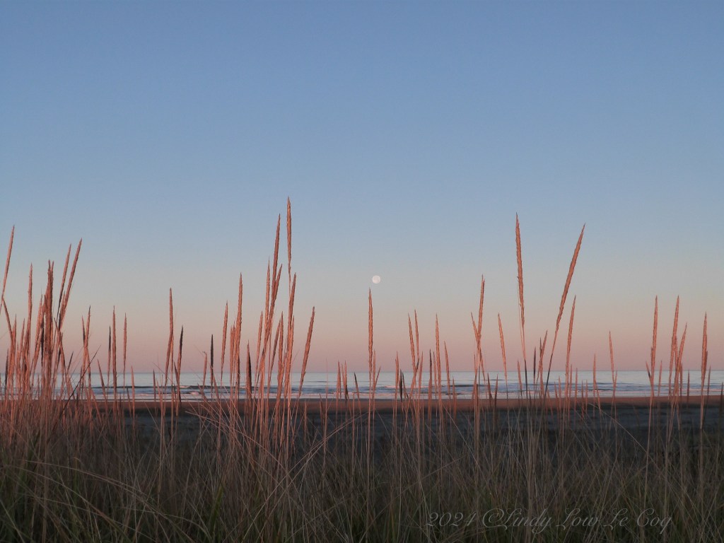 Sometimes the background is the subject, as in the photo below featuring a full moon setting. The morning sunlight on Ryegrass in the foreground frames and anchors the view.