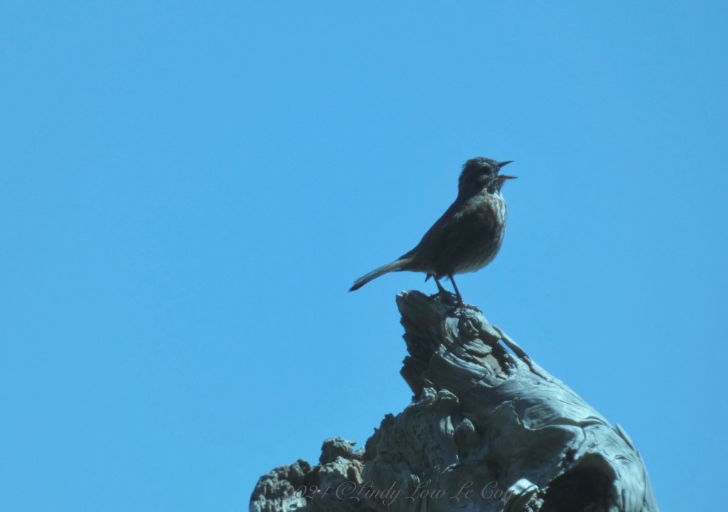 Because birds are always on the move, getting a focused shot of them in their natural habitat can be tricky. Below are two shots of a Song Sparrow. On the left, the bird blends right into its driftwood setting, on the right the bright blue sky provides a stand out profile.