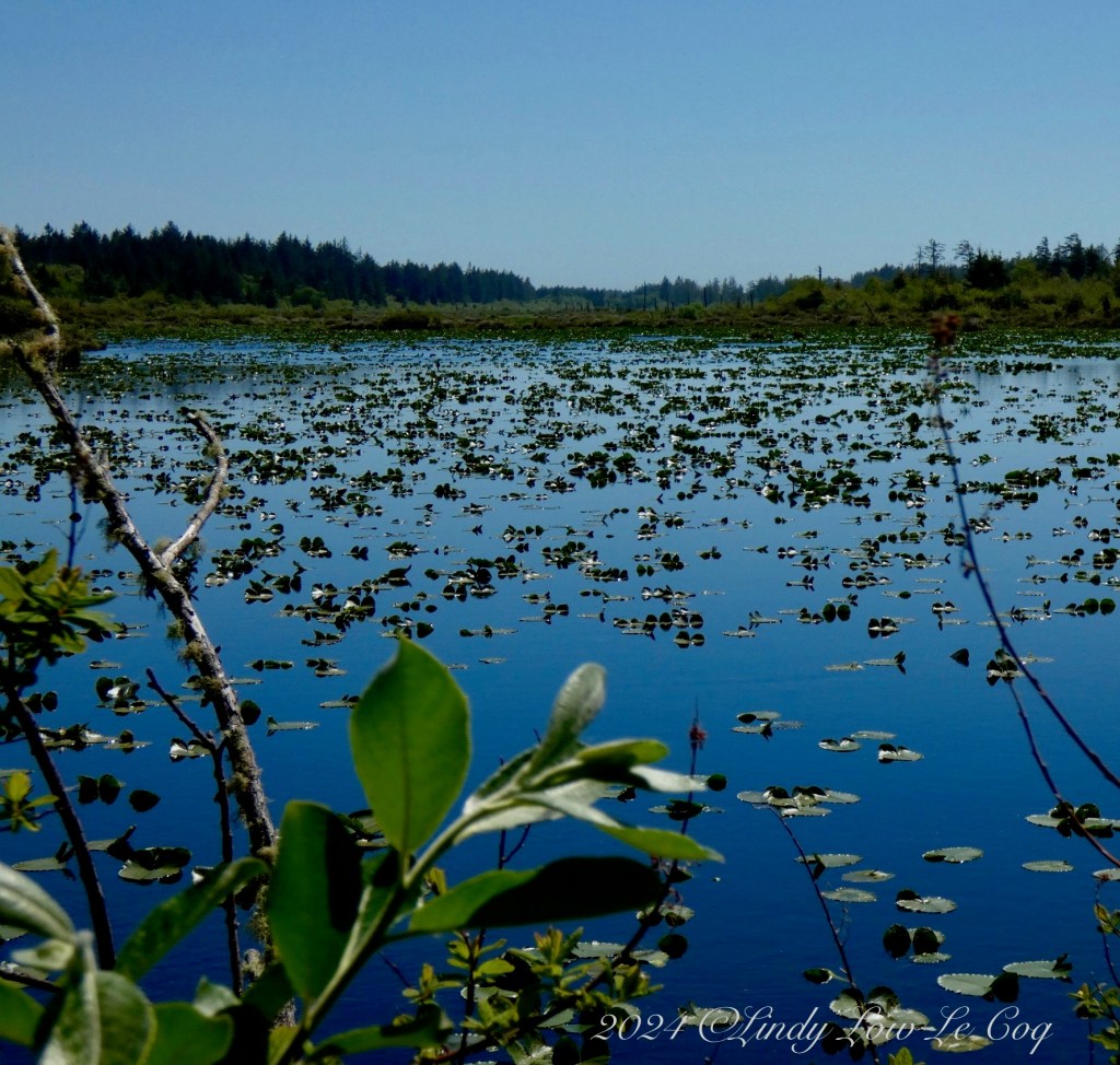 Blue calms me, brings a smile to my face and sets my heart to singing. One step over on the color wheel is green, the dominant color in the Pacific Northwest USA. Below Martha’s Marsh, near Leadbetter Point State Park WA, hosts a profusion of water lilies as spring starts to move toward summer.