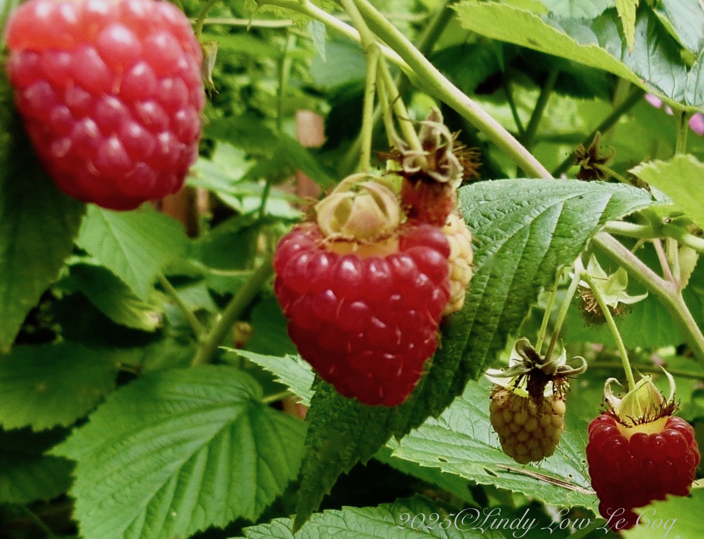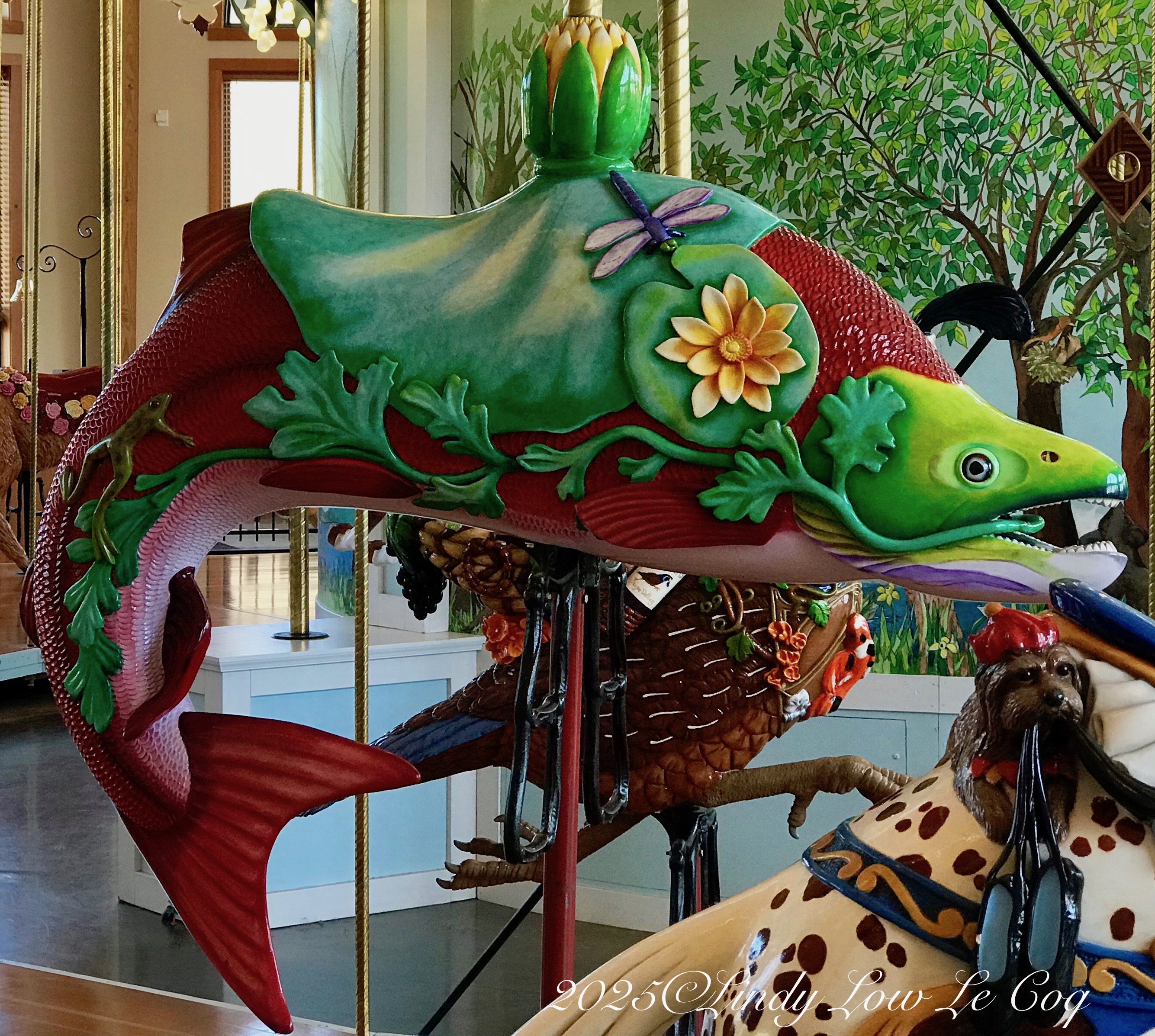 Where else would you find a Chinook salmon in a Carousel?! Albany, OR is only 90 miles (144 km) from the north Pacific Ocean where Chinook are native to the ocean and the river systems of western North America. Red blossoms of Major Wheeler Honeysuckle on the vine, and ripe raspberries resting upon green foliage present a vivid statement in my gardens. Red and Green are a happy pairing!