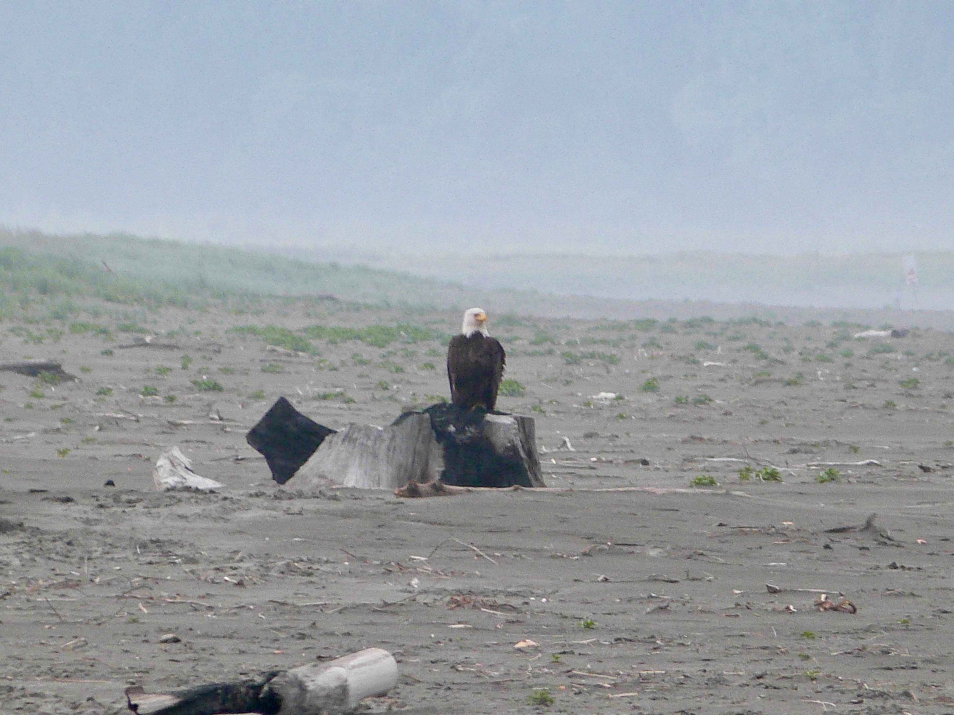 Every day Jello and I would take morning and afternoon walks to the now deserted beach. The absence of vehicles was a pleasant change, and though I would see people now and then, they were few and far between. The other life change I began to notice was a significant increase in Bald Eagle activity. From mid-March through the end of May, I was in the company of several Bald Eagles; individuals and pairs. Wind and tide had washed two big snags onto the beach and they were favorite Eagle perches.