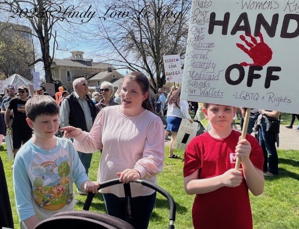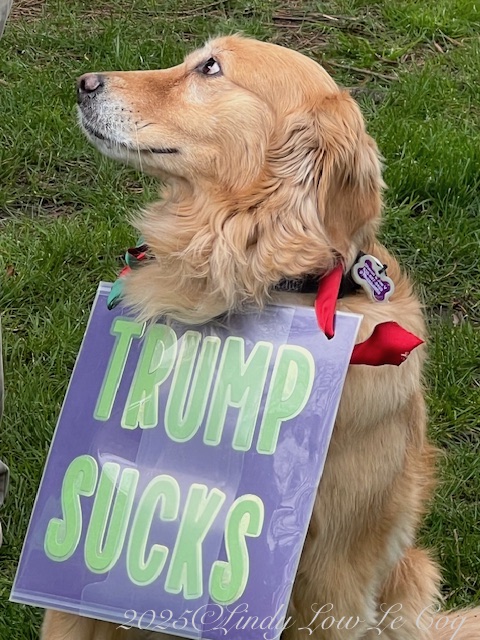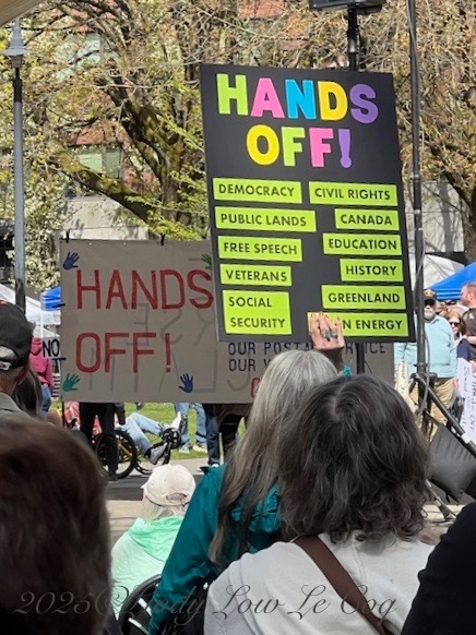 On this lovely sunny Saturday, I joined with my community to peacefully demonstrate that a large part of WE THE PEOPLE do not support what the Trump administration is doing to wreck our country, destroy our economy, up-end our lives, de-fund entities that we depend upon and expect to be there when we need/want them, to cause us to be less safe, less healthy, less wealthy, less educated, and in one small-handed swipe disrupt a world order that was doing quite nicely without him. We were a large crowd for a “purple” county, around 3000 – 4000, all ages, all walks of life. This is a small sampling of the many creative signs on display.
