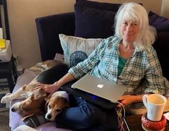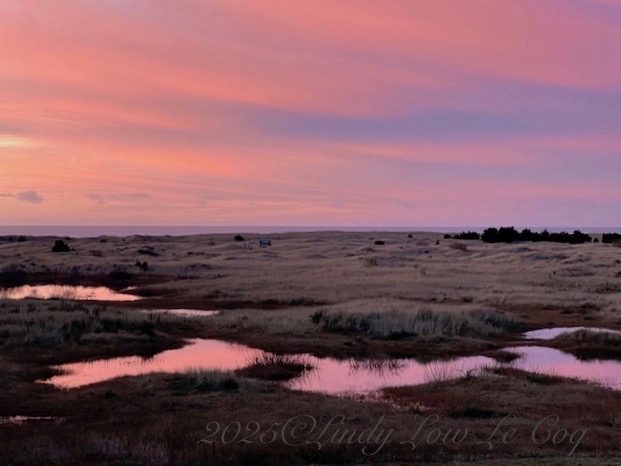 Creighton took this snapshot of me with Daisy and Max in my favorite spot inside our condo; the big purple chair. From here I can see out the windows across the marsh/meadow to the berm and beyond. We stay here a couple weeks a month between mid September, through mid June, and leave it available for guests during the busy summer season.