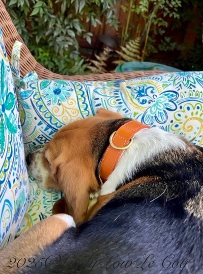 Whether I’m reading, writing or thinking, the tranquility of this space always does the trick. Max likes to curl up on the loveseat next to me, while Daisy patrols the grounds or searches in the pond for the elusive Koi.