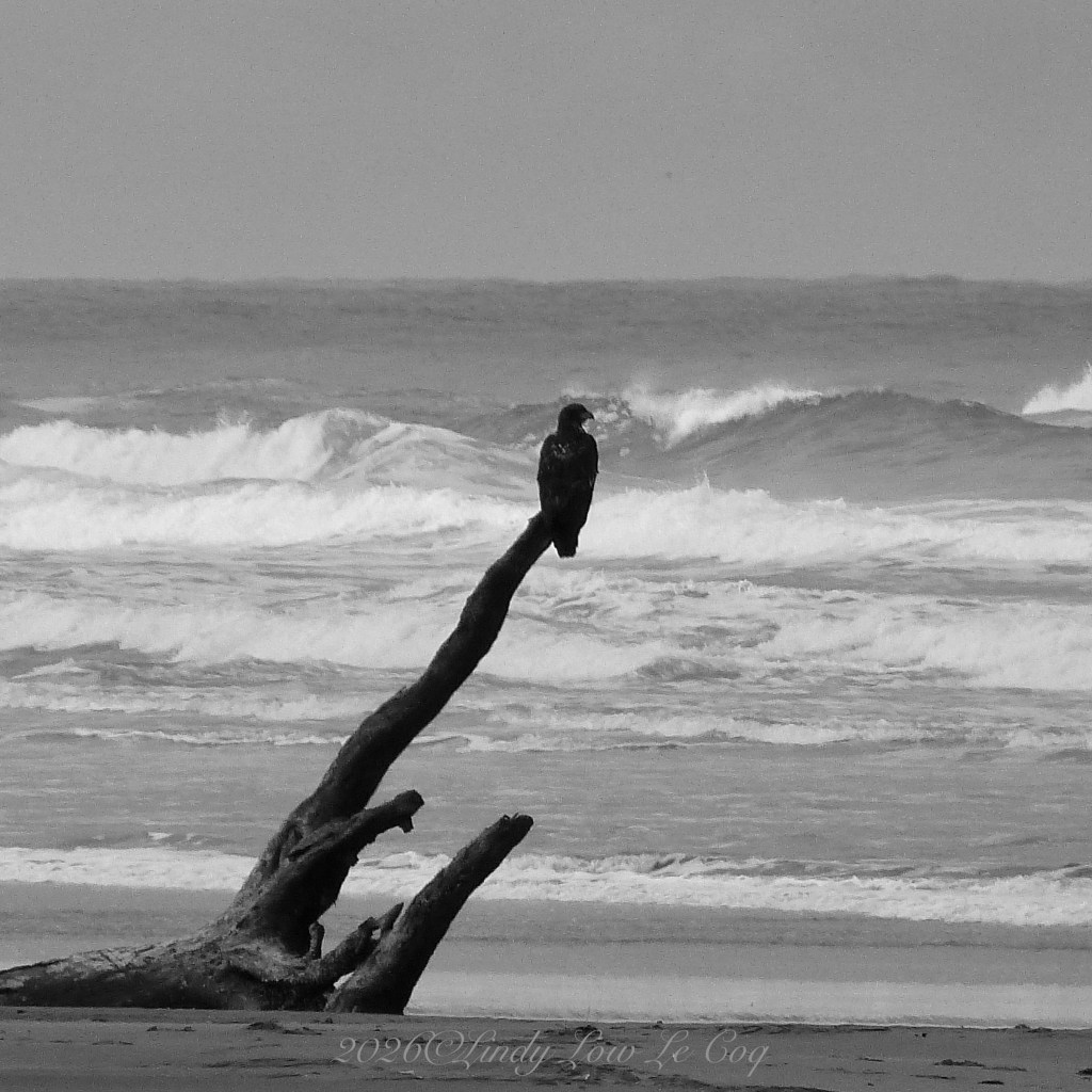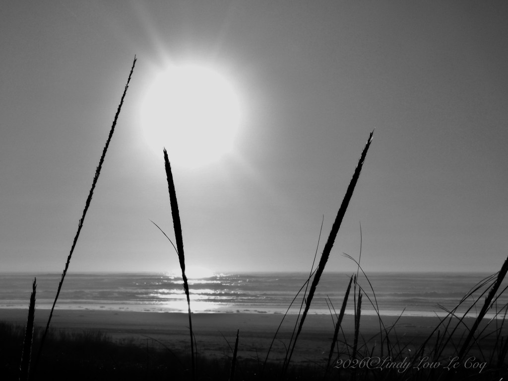 Ritva asks us to stretch our photographic skills this week by presenting minimalist images in Black & White. For a lover of color, this is indeed a challenge! All of the images I’ve selected started as color shots and have been converted to B&W, including monotone shots like this one, taken on a very foggy morning at the Breakers, Long Beach, WA.