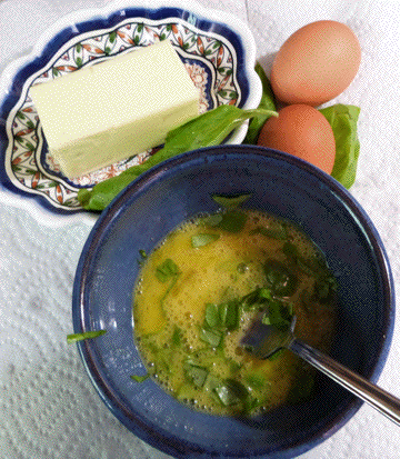 Two fresh eggs, 5 shakes of salt, 6 shakes of pepper, 2-3 basil leaves snipped with shears, stir vigorously with fork…